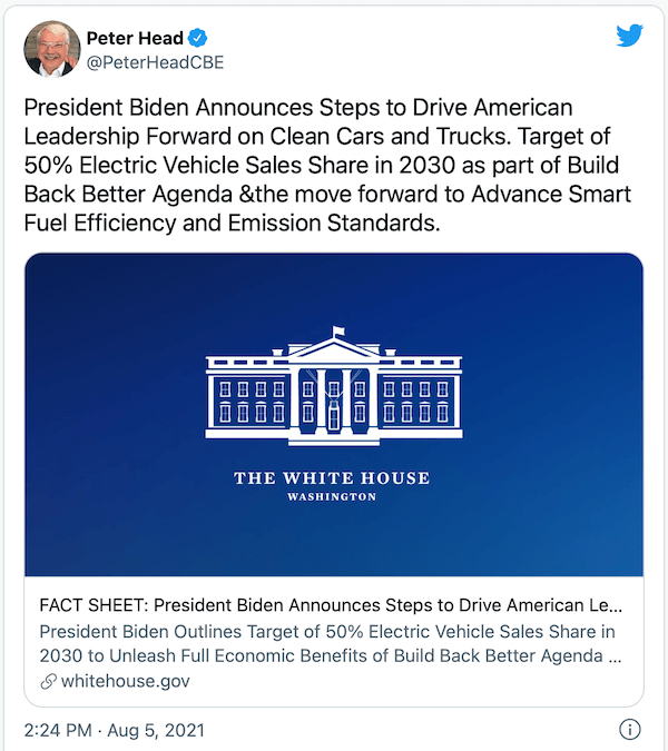Oh yes. In early August 2021, Biden signed an executive order to make half of all new vehicle sales by 2030 zero emissions vehicles.